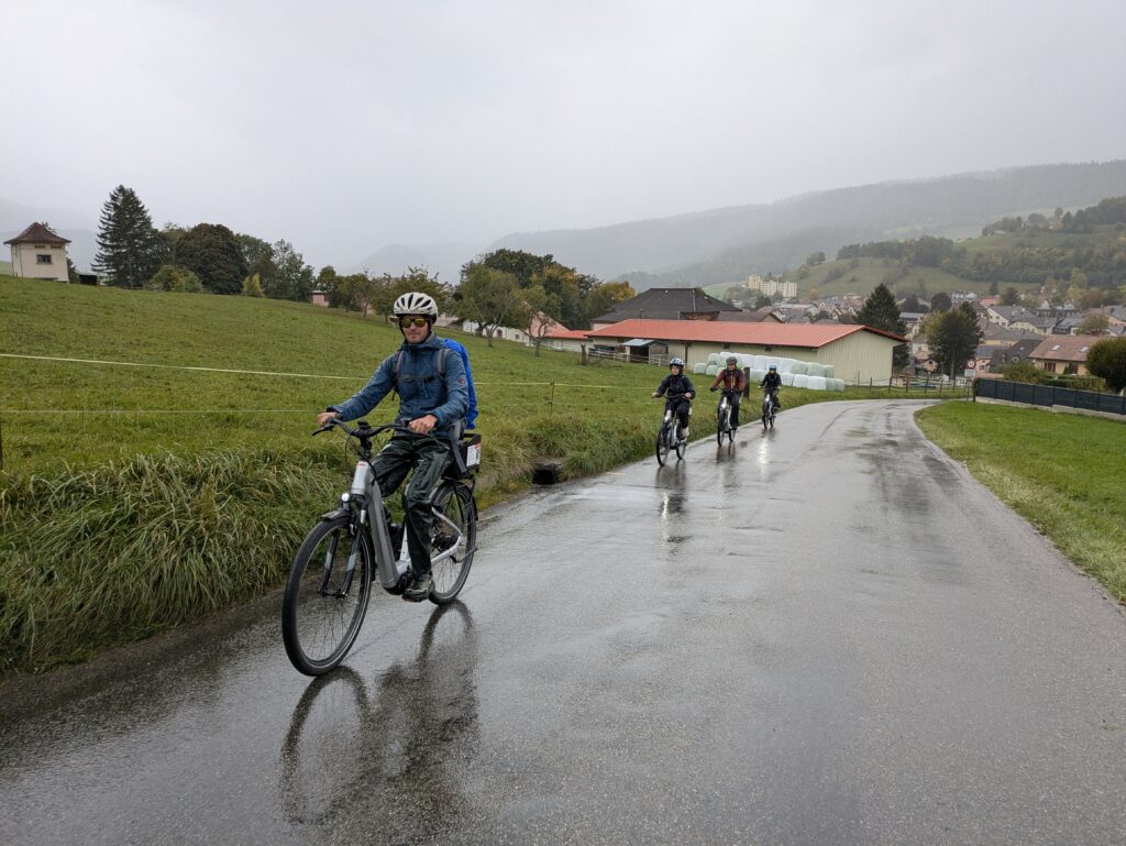 Kaum wieder am Tageslicht, begrüssten uns die ersten Regentropfen. Und sie sollten bleiben. Also hiess es: Regenschutz anziehen, Zähne zusammenbeissen und los gehts. Mit fast leeren Batterien schafften wir es noch über den Pass nach Mauborget, und von dort glücklicherweise nur noch bergab nach Yverdon-les-Bains. Der Ortsname verrät es schon, hier sprudeln Thermalquellen. Genau das Richtige für unsere durchnässten Körper. Also kurz in die Sauna, wieder auf Betriebstemperatur kommen und den Abend bei Pizza und guter Laune ausklingen lassen.